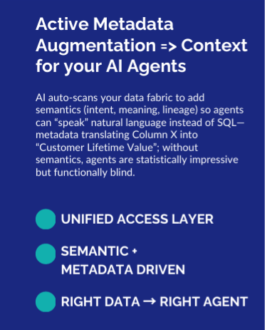 Most failures aren’t model issues—they’re data issues. Enterprises are overwhelmed by multimodal data and constrained by static pipelines, so agents lack the context (semantics, lineage, meaning) needed to reason and act safely. Active metadata augmentation + a semantic layer (ideally grounded in ontology/knowledge graphs) is the missing layer.